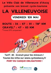 EVT-20260510/1LA LEGENDE (route) avec 220 km, dont 54 km de secteurs pavés, reste la randonnée la plus longue de ce type en France. Quant au RAID (vtt) les participants de l’édition 2025 ont pu déjà se mesurer au nouveau parcours. Pour que tous puissent vivre cette expérience particulière une distance de 45 km a été introduite en route et vtt. Ce sont donc cinq circuits route (220-165-130-75-45 km) et trois vtt (130-70-45) qui sont proposés. Sortie club du dimanche S19Sortie club du dimanche S19Heure/min: 00:00