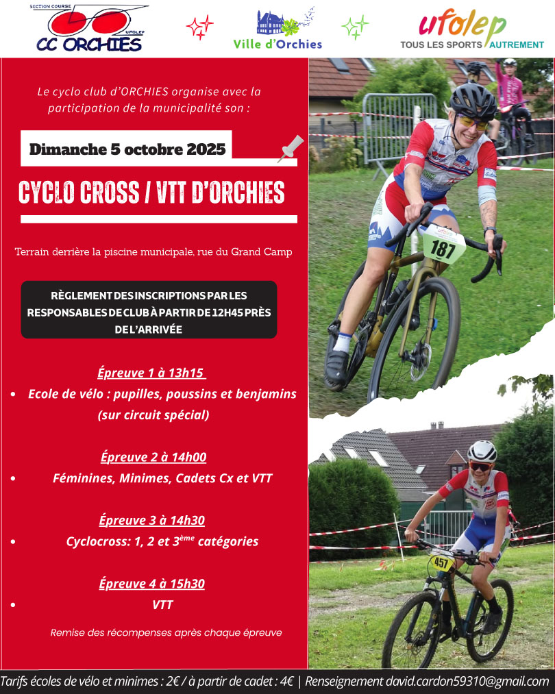 Le 05 Octobre, le CC Orchies vous donne rendez-vous pour le traditionnel cyclo cross VTT . L’épreuve se déroule comme d’habitude sur les terrains avoisinant la piscine d’Orchies rue du Grand Camps avec un parking qui pourra accueillir les coureurs.