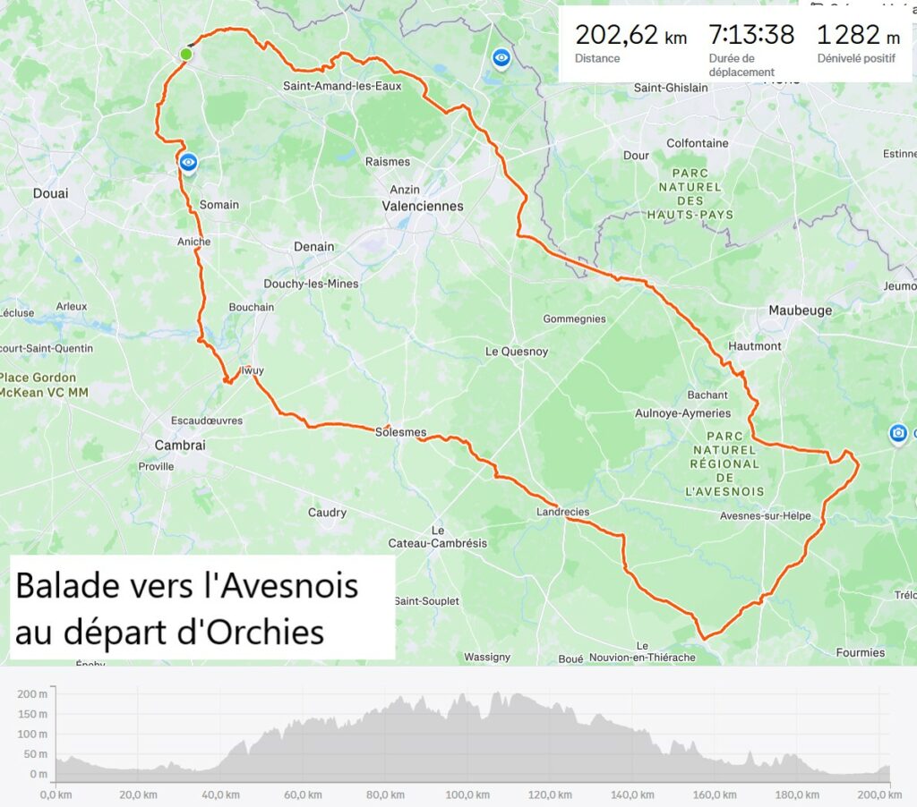 Après avoir traversé un secteur assez urbanisé au nord de Valenciennes (Fresnes, Vicq, Quarouble), nous retrouvons le calme de la campagne dès le charmant village de Sebourg. Nous contournons ensuite la ville de Bavay au passé gallo-romain, ancienne capitale des Nerviens. Direction sud-est ensuite ; sur les routes pittoresques de la petites « Suisse du Nord » nous profitons d’un revêtement récemment refait, c’est très agréable. Il en sera ainsi sur une bonne partie du parcours, les routes de l’Avesnois sont bien entretenues.