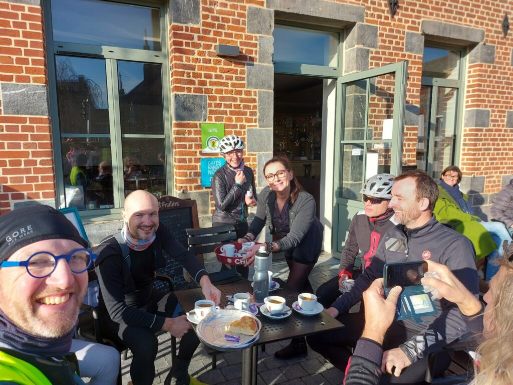 Nous marquons une 1ère pause au km 80 à Dourlers au café-bar Le Bi’Stroh. Les doubles expresso et viennoiseries achetées à la boulangerie voisine nous revigorent. Il fait à présent 12 degrés et le soleil brille, nous nous installons donc en terrasse ! Etre en terrasse au mois de janvier c’est quand même exceptionnel, . . . Nous reprenons la route vers le sud-est et les choses se compliquent un peu car l’Avesnois n’est pas le « plat pays ». Il y a du relief (800 m de D+ en 60 km). Nous formons alors 2 groupes afin que chacun puissent rouler à son rythme et se faire plaisir, . . . Les routes tranquilles de l’Avesnois sont idéales pour la pratique du vélo et les paysages sont jolis, même en hiver, A Sars-Poteries nous obliquons vers le sud afin de rejoindre Etroeungt – point de « non-retour » de notre randonnée. 5 km après Etroeungt nous prenons la direction du nord-ouest ce qui nous met dans le bon sens par rapport au vent qui n’est certes pas très fort en ce début d’après-midi. Même si le vent est léger, il est toujours préférable de l’avoir dans le dos. Prisches et Landrecies sont d’autres localités sympathiques de l’Avesnois que nous traversons.