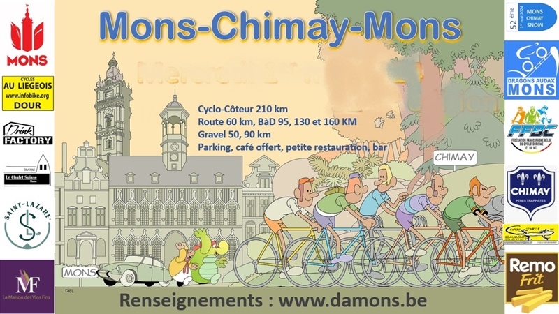 54ème Mons-Chimay-Mons 2026 est un événement vélo de gravel, vélo de route catégorie cyclosportive, randonnée en Belgique, Wallonie limité à 2500 participants et a été organisé pour la première fois en 1972. L’ édition 54ème Mons-Chimay-Mons 2026 fait partie du circuit Brevets Cyclo Côteur Belge et aura lieu le vendredi 01 mai 2026 avec départ à Mons, province Hainaut, Wallonie.
